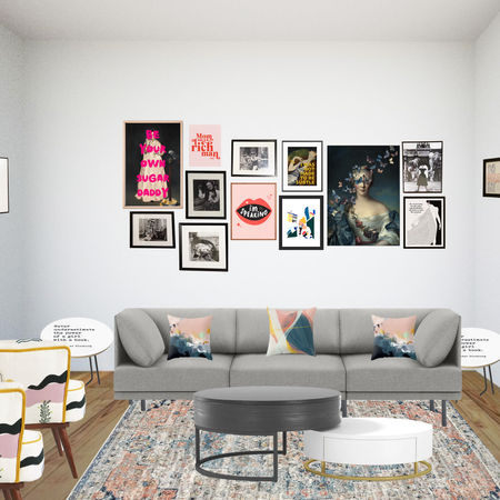 This townhome was envisioned for a colorful, feminine character in New York. She wanted art that reflected her passion for women's rights, literature, and urbanity. The living space doubles as a space to write with a convertible coffee table. The owner's love of color and music are balanced by the bright light walls. Fun, engaging furniture makes the space ideal for entertaining and listening to records. The bathroom, while small, maintains the bold choices throughout the apartment with use of a wall mural. Geometric fixtures keep the space modern and whimsical.