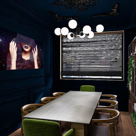 This condo was inspired by the owner's visit to Paris. The large windows provide substantial natural light, presenting a perfect opportunity for her houseplants. Natural materials in the kitchen are mixed with industrial materials. The ceiling is painted a deep blue to unify the space into a rich, cosy living area.